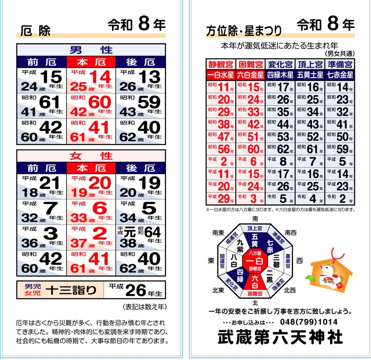 令和8丙午歳厄除・方位除表 2025年12月11日 最新のお知らせ 武蔵第六天神社では新春祈願祭を随時執り行います。 ※上記厄除表の赤字にあたる方は本年本厄の年になります。 ※上記方位除表の中央に位置⦅一白水星⦆する方は八方塞、北に位置⦅六白金星⦆する方は運気低迷の年と なります。